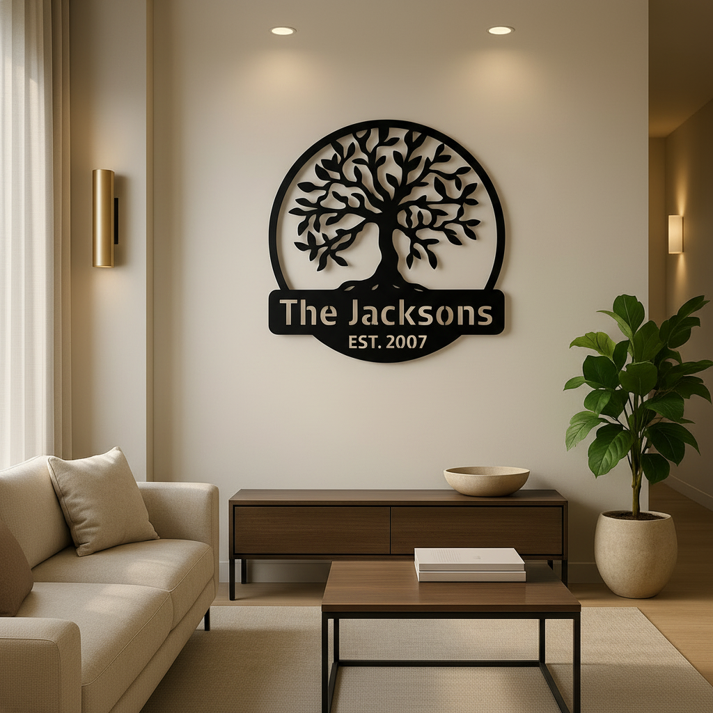 Tree of Life Family Name Monogram - Personalized Metal Wall Art - S - 60cm / Black (Matt)
