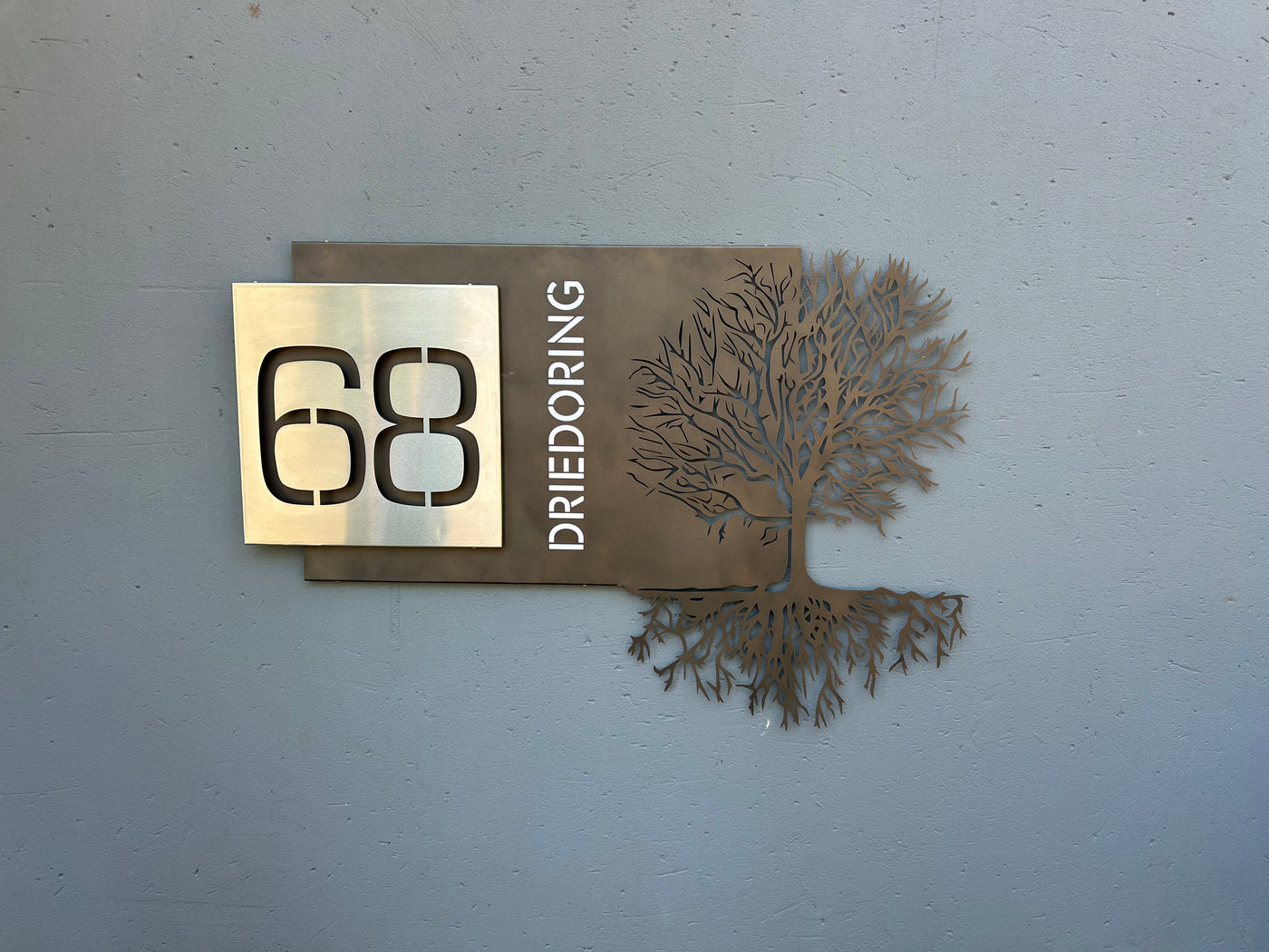 Signature Tree-of-Life House Number - Brushed Stainless + Powder Coated Mild Steel Back Plate / Black Bronze / 750mm x 500mm
